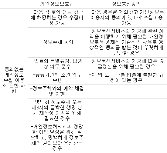 개인정보보호법과 정보통신망법 개인정보 처리 관련 법제 비교 현황