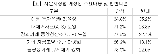대체거래소 도입, 대형투자은행(IB) 육성, 장외파생상품 중앙청산소(CCP) 도입 등을 골자로 한 개정 자본시장법에 대해 80.0%가 국회 통과를 희망한다고 답했다. 주된 이유는 `자본시장 인프라의 선진화 가능`(29.9%), `기업 자금조달 수단의 양성화 확보`(17.1%), `투자자 보호 강화`(4.3%) 등을 들었다.
