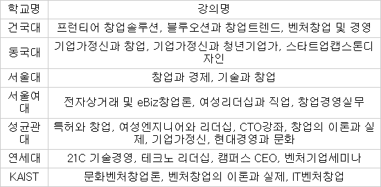 연세대도 올해 창업 강좌가 `21세기 기술경영` `테크노 리더십` `캠퍼스 CEO` 등 8개에 달한다. 3~4년 전까지 한두 개에 불과했다. 학교 관계자는 “창업 강좌는 수강 신청을 시작하자마자 마감되는 `10초 강좌`로 인기가 높다”고 설명했다. 동국대도 지난해 `기업가정신과 창업` `기업가정신과 청년기업가` 두 강좌에서 `스타트업캡스톤디자인`을 추가했다. 학교 측은 “창업지원단 요청으로 강좌를 늘렸다”며 “학생 수요를 반영한 것”이라고 밝혔다. 한양대도 2009년 창업 관련 강의가 세 과목에 그쳤으나 이후 꾸준히 늘어 신학기에는 6~7개 과목을 개설한다.