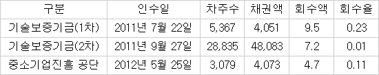 20일 관련 기관에 따르면 지난해 캠코는 기술보증기금으로부터 약 4조8000억원어치 부실채권을 헐값에 사들였다. 2011년 4051억원어치의 1차 채권까지 포함하면 부실채권 규모는 5조2000억원이 넘는다.