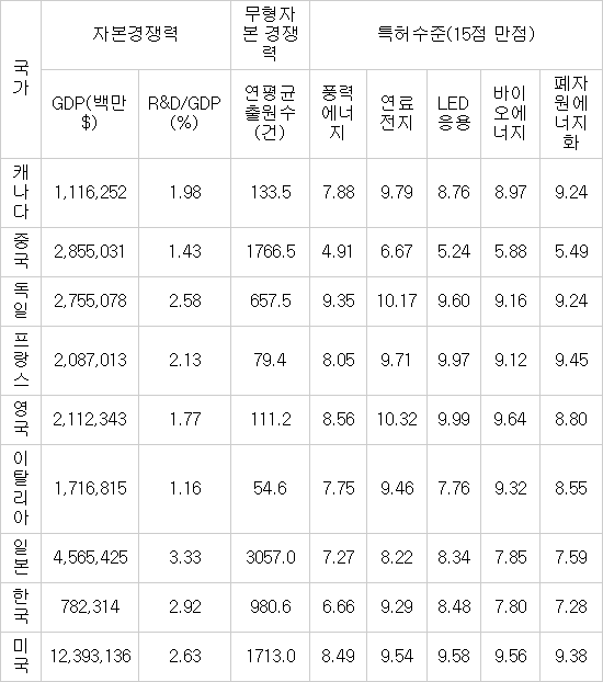 5대 분야의 국가경쟁력, 특허보유 수준, 기술역량을 종합적으로 검토한 결과, 미국과 일본이 자본 경쟁력과 무형자본 경쟁력에서 앞서는 것으로 조사됐다. 한국은 GDP 규모에 비해 R&D 투자 비율과 특허수준이 상대적으로 높은 수준이었다.