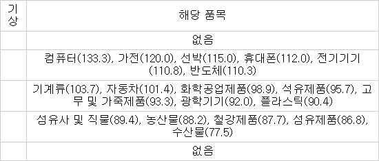 품목별로는 선박과 주요 IT제품 수출이 호조를 보일 것으로 예상됐다. 선박은 하반기 드릴십, FPSO 등 고부가가치선 인도가 예정돼 있고, 자동차는 상반기 노조파업으로 인한 생산차질이 진정되면서 하반기에는 성장세가 예상됐다. 반도체는 상반기 메모리반도체 단가상승세가 하반기까지 이어지면서 수출호조세가 지속될 것으로 예상됐다. 휴대폰도 3분기 최신형 고가 모델 출시로 수출에 탄력을 받을 전망이다. 반면 철강 및 석유제품 등은 2분기 보다 수출경기가 어두울 전망이다.