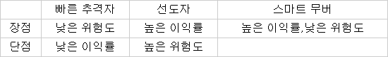 그렇다면 스마트 무버는 어떻게 좋은 기회를 잡을 수 있는 것일까. 빠른 추격자, 선도자, 스마트 무버의 장단점을 비교한 표에서 보듯이 스마트 무버는 선도자와 빠른 추격자의 장점을 취할 수가 있고 단점은 줄일 수가 있다. 이 표면적인 이유 이외에도 더 중요한 내용이 숨어 있다.