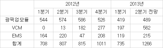 갤럭시S4 효과로 2분기 아이엠 보이스코일모터(VCM)사업부 매출은 전 분기 대비 185% 늘었다. 광픽업 모듈 사업도 1분기보다는 좋은 흐름을 보이고 있다. 아이엠의 2분기 매출은 1260억원 이상, 영업이익은 흑자전환에 성공한 것으로 보인다.