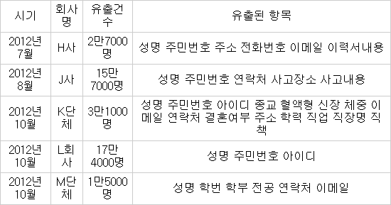 이들 5건의 사건에서 유출된 개인정보는 주민등록번호와 전화번호 등 다양하다. 특히 개인이 구직을 위해 제출한 이력서 내용, 급여정보, 결혼여부, 혈액형 등 민감한 정보도 들어있다.