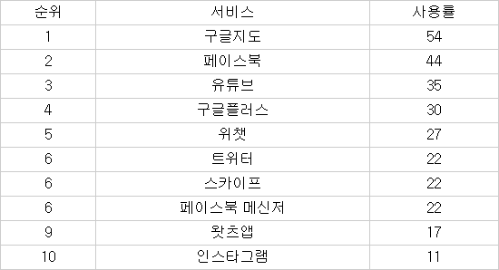 [표]세계에서 가장 인기 있는 앱 베스트 10.(단위:%)