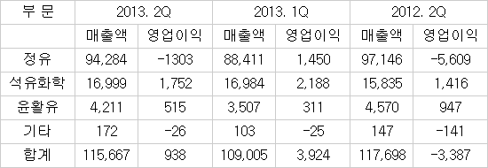 정유부문은 정기 시설보수와 글로벌 경기 회복 지연에 따른 정제마진 축소로 9조4284억원의 매출과 1303억원의 영업적자를 기록했다. 전년 동기와 비교해 적자 규모는 4306억원 축소됐다.