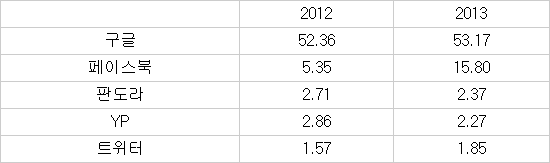 이마케터는 올해 매출 기준 페이스북 모바일 광고 시장 점유율이 15.8%에 이를 것으로 점쳤다. 1위인 구글(53.2%)에는 한참 못 미치지만 판도라(2.4%)와 트위터(1.9%)보다 월등히 앞선다.