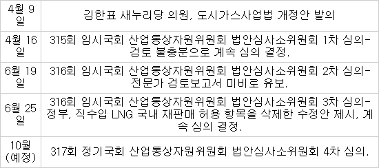 김한표 의원이 발의한 도시가스사업법 개정안은 현재 금지된 민간사업자의 LNG 직수입과 재판매를 허용한다. 법안이 통과되면 민간사업자는 가스공사에서만 가스를 공급받았지만 앞으로는 해외에서 직수입은 물론이고 제3자에 판매와 교환이 가능해진다.