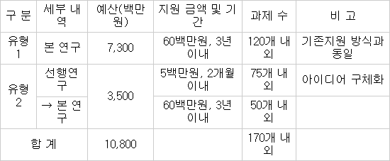 지원 대상으로 선정된 연구자는 2개월간 아이디어를 구체화하는 사전 연구를 진행해 연구 계획서를 작성해야 한다. 미래부는 연구 계획서를 대상으로 원탁토론형식의 평가를 거쳐 최종 연구과제 50개 내외를 선정, 3년간 지원할 계획이다. 미래부는 신진연구자사업의 기존 지원 방식을 따른 `유형 1`에서도 120여개의 연구과제를 선정해 3년간 지원한다.