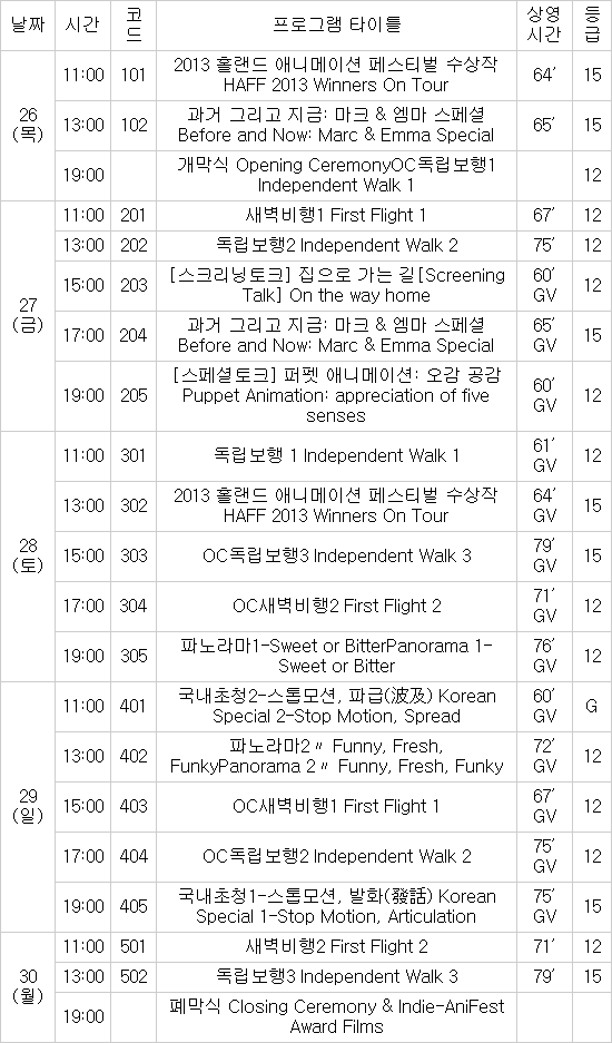관람등급 G:전체관람가/General, 12: 12세 미만 관람불가, 15: 15세 미만 관람불가, OC:본선 심사 진행, GV:감독과의 대화 및 게스트 토크