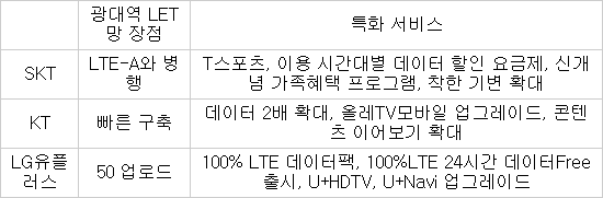 3사 모두 광대역 LTE 서비스를 기점으로 △데이터 리필 등 특화 요금제 △게임, 동영상 전용 서비스 △세대별 전용 요금제 등 신규 서비스를 경쟁적으로 출시할 계획이다.