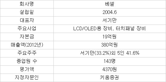 LCD·OLED 장비제조업체인 베셀(대표 서기만)은 LCD·OLED인라인 시스템, 베이크오븐(Bake Oven), TSP 다이렉트 본딩(Direct Bonding) 장비 등을 제조해 판매한다. LCD 장비 제작 기술력을 인정받아 LG디스플레이와 많은 개발 프로젝트를 수행했다. LG디스플레이와 함께 다이렉트본딩 장비를 공동 개발하는 등 국내 대기업과 지속적인 거래를 유지하고 있다.
