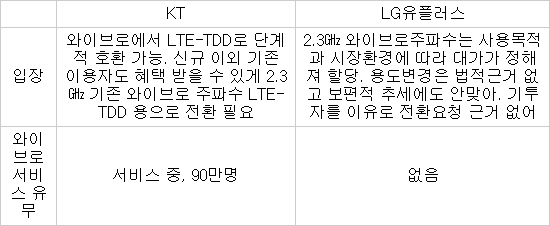 와이브로 서비스가 없는 LG유플러스는 KT 주장을 정면 반박했다. 강학주 LG유플러스 상무는 “와이브로용으로 할당된 2.3㎓를 LTE-TDD용으로 바로 전환해달라는 것은 일반적인 절차와 어긋난다”며 “단순히 그동안 와이브로에 투자를 많이 했다는 이유로 용도를 변경해달라는 논리는 맞지 않다”고 반대 입장을 밝혔다.