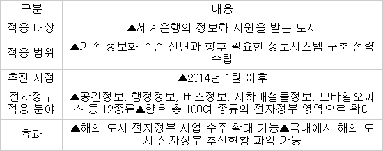 우리나라가 마련한 도시 정보화 방법론은 도시의 환경 분석을 기반으로 정보시스템 수준을 진단, 필요한 전자정부 정보시스템을 제시해주는 형태로 돼 있다. 예를 들어 해당 도시의 인구와 경제수준, IT인프라 현황, 시장이나 시의회의 정보화 의지 등을 분석해 구축해야 할 정보시스템을 알려준다. 구축이 필요한 시스템에 대해 별도 40~50페이지 분량의 보고서도 제공한다.