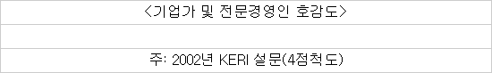 전문경영인 호감도 역시 77%에서 66%로 하락하는 등 기업인에 대한 전반적 호감도가 하락했다. 한경연은 “지난해 유럽연합집행위원회(EC)가 발간한 기업가정신 관련 보고서에 따르면 한국의 기업가 호감도는 34%로 미국 60%, 유럽연합(EU) 27개국 평균 53%에 비해 낮았다”고 설명했다.