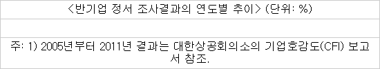 국내 기업 전반에 대한 호감도를 묻는 질문에는 63%의 응답자가 긍정적이라고 답했다. 전년(68%) 대비 하락했다. 반기업 정서의 가장 큰 원인으로는 탈법 및 편법 등 기업 내부의 문제(43%)라는 답변이 가장 많았다.