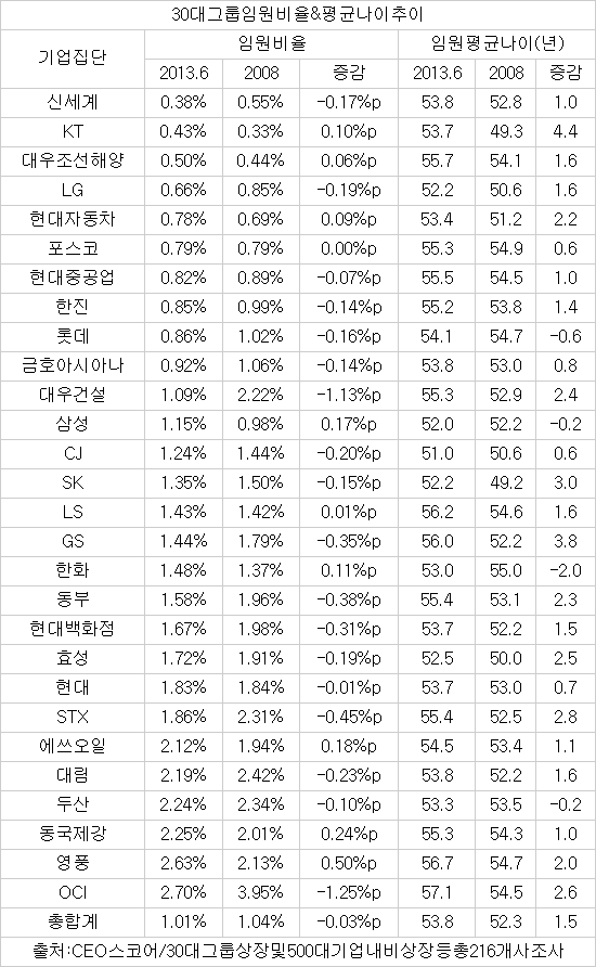 상무는 평균 51.4세, 전무 54.5세, 부사장 55.7세, 사장 57.2세로 2∼3세의 터울을 보였다. 상무부터 사장까지 30대 그룹 임원 평균 나이는 모두 50대로 채워져 있다.