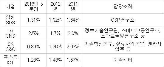 2일 업계에 따르면 삼성SDS·SK C&C·포스코ICT 등 대형 IT서비스기업의 3분기 누적 R&D 투자비율은 0.89~1.31%인 것으로 조사됐다. LG CNS만 2.5%로 유일하게 2%를 넘어섰다.