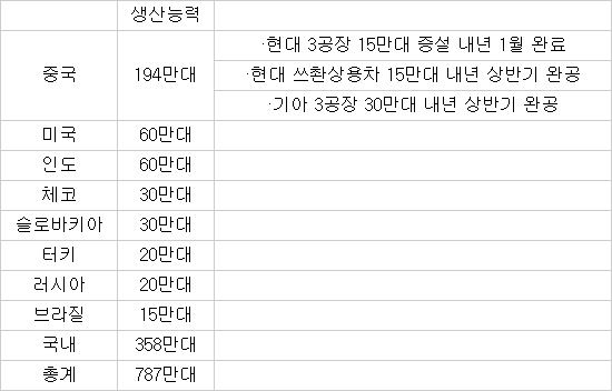 현대·기아차는 성장 목표를 달성하기 위해 해외 생산량을 지속적으로 늘려나갈 계획이다. 현재 727만대인 글로벌 생산능력을 내년 상반기까지 787만대로 늘린다. 현대차 중국 베이징 3공장 15만대 라인증설이 내년 1월 완료되고 15만대 규모 쓰촨상용차가 상반기 완공될 예정이다. 기아차도 30만대 규모 중국 3공장을 내년 상반기 완공한다. 현재 51.2% 수준인 해외 생산 비중은 내년 54.5%까지 높아진다. 800만대 달성을 위해 부족한 13만대 정도는 해외공장 가동률을 100% 이상 유지하면 어렵지 않게 생산할 수 있을 것으로 전문가들은 내다보고 있다.