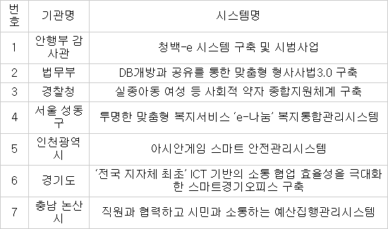 지방자치단체 공무원들의 비리를 근절하기 위해 운영 중인 `통합 상시모니터링 시스템(청백-e)` 등 7개 공공부문 서비스가 `2013 전자정부대상` 최종 후보에 올랐다. 시상식은 오는 16일 오후 4시 20분 박찬우 안행부 제1차관 등이 참석한 가운데 한국정보화진흥원에서 진행될 예정이다.