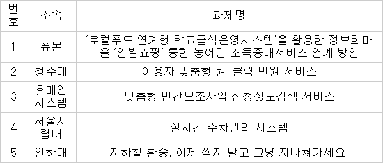 전자정부대상 심사위원회(위원장 황수찬)는 서면심사 및 심사위원 합동심사, 현장심사를 거쳐 공공 부문 7개, 민간 부문 5개 등 총 12개 응모기관을 최종 대상 후보로 선정했다고 밝혔다. 이번 행사에는 공공부 문과 민간 부문에서 각각 49개, 21개 기관이 신청했었다.