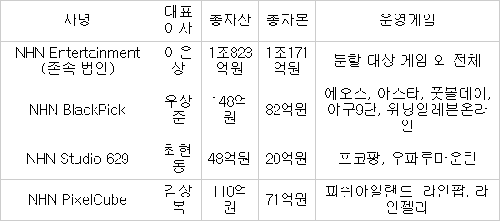 신설 회사는 `NHN블랙픽` `NHN스튜디오629` `NHN픽셀큐브` 3개다. NHN엔터테인먼트가 100% 지분 출자한다. 내년 1월 29일 임시주주총회를 열고 승인을 완료하면 2월 1일부로 분할을 실시한다.