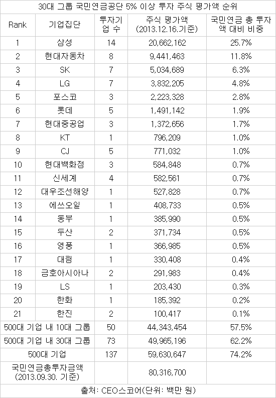 137개사에 대한 투자액은 총 59조6306억원으로 이는 국민연금 총 주식투자 평가액 80조3167억원(9월30일 기준)의 74.2%에 달한다. 500대 기업 내 30대 그룹으로 범위를 좁히면 73개사, 49조9652억원으로 비중은 62.2%에 달한다.