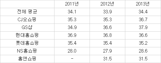 판매 수수료율이 가장 높은 업체는 37.9%를 기록한 GS샵이다. CJ오쇼핑(36.7%), 현대홈쇼핑(36.7%), 롯데홈쇼핑(35.2%)이 뒤를 이었다. 홈앤쇼핑과 NS홈쇼핑은 각각 31.5%, 28.6%로 나타났다.