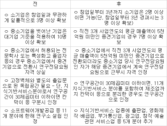 기업부설연구소 설립 인정기준 완화 전·후 비교
