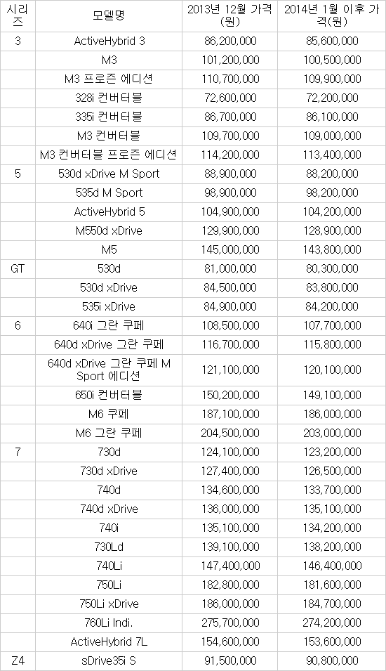 [표]BMW코리아 2014년 가격표