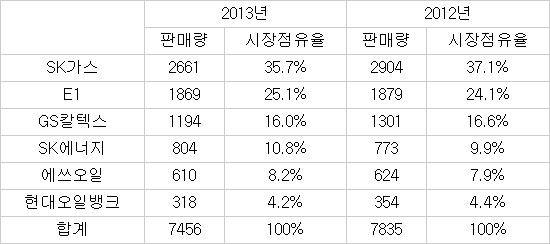 LPG수입사와 정유사 판매량도 대부분 감소했다. 시장점유율 1위인 SK가스는 지난해 266만1000톤을 기록, 전년도 290만4000톤보다 판매량이 약 9%P 줄었다. GS칼텍스, 에쓰오일, 현대오일뱅크 등 정유사 판매량도 각각 119만4000톤, 61만톤, 31만8000톤으로 전년도에 비해 2~11%P 감소했다.