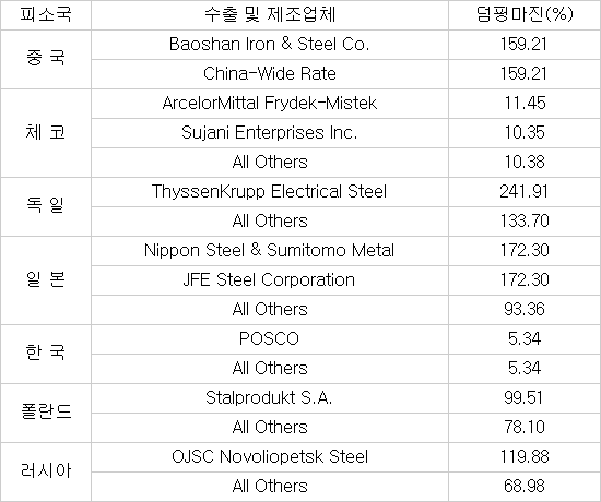 이에 미 상무부는 지난해 10월 반덤핑 조사에 착수했으며 지난 5일 두 업체의 덤핑마진이 5.34%라고 발표했다. 대미 수출 규모가 가장 큰 일본기업은 172.30%의 덤핑마진을 판정받았고 독일기업은 241.91%로 가장 높은 덤핑마진을 판정받았다.