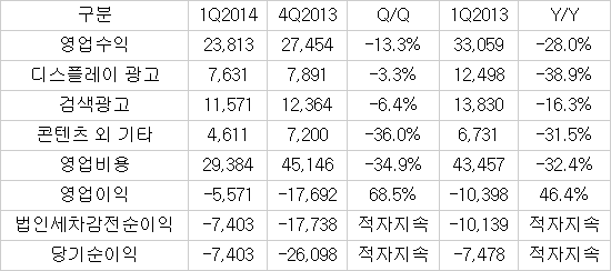 SK커뮤니케이션즈(대표 이한상)가 지난 1분기에 매출 238억원, 영업손실 56억원, 순손실 74억원을 기록했다고 9일 공시했다.