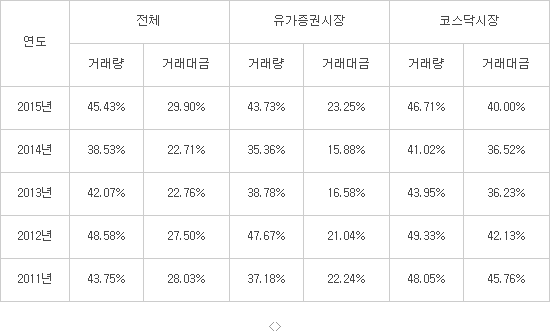 거래소는 “지난해 데이트레이딩 비중은 2012년 48.58% 이후 최고치”라며 “거래가 늘어난 원인도 있지만 스마트폰 등을 이용한 거래 편의성이 좋아진 이유가 크다”고 설명했다.