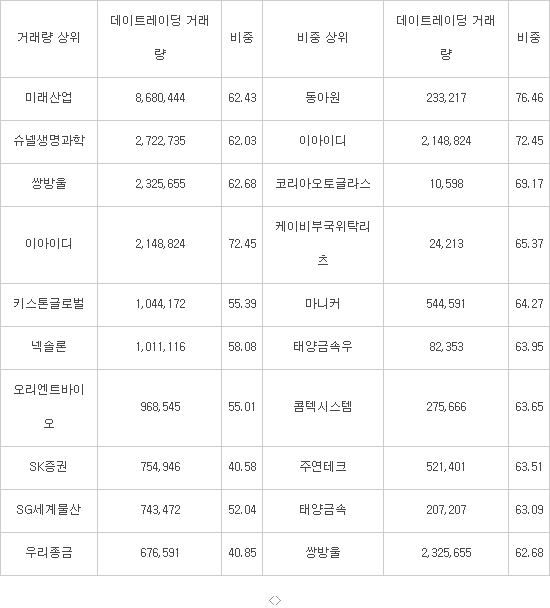 데이트레이딩으로 이뤄진 유가증권시장 거래량 상위 종목은 미래산업, 슈넬생명과학 순이었고 비중이 높은 종목은 동아원, 이아이디 순이었다.