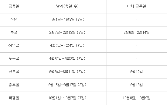 공휴일을 지정한 중국 정부 문서는 ` 수정에 관한 국무원 결정`(국무원령 제644호)이다. 2014년 1월1일부터 시행 중이다.
