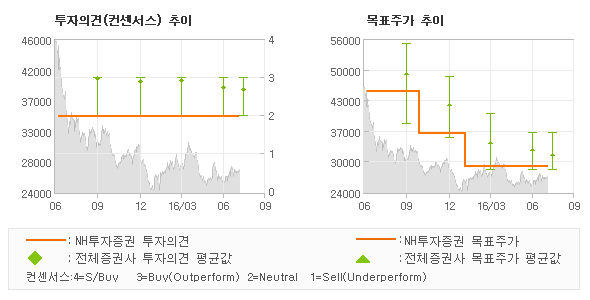 NH투자증권의 동종목에 대한 최근 1년동안의 투자의견은 전체적으로 큰 변화없이 유지되고 있다. 목표주가는 2015년7월 45,000원까지 높아졌다가 2016년2월 29,000원을 최저점으로 목표가가 제시된 이후 최근에도 29,000원으로 제시되고 있다.