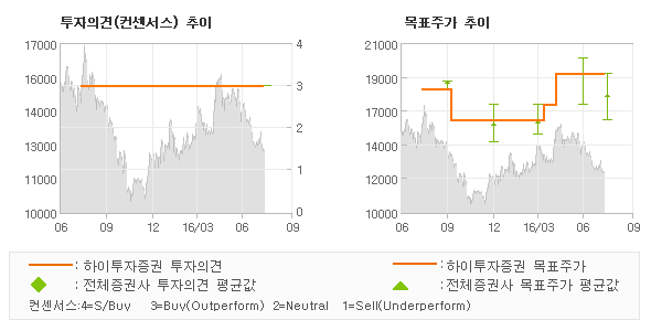 하이투자증권의 동종목에 대한 최근 1년동안의 투자의견은 전체적으로 큰 변화없이 유지되고 있다. 목표주가는 2015년8월 16,000원이 저점으로 제시된 이후에 최근에는 19,000원까지 상향조정되고 있다.