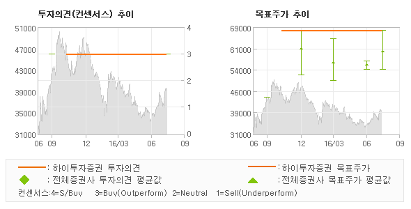오늘 하이투자증권에서 발표된 '매수(유지)'의견 및 목표주가 68,000원은 전체 컨센서스 대비해서 대체적으로 평균치에 해당하는 수준으로, 이번 의견은 동종목에 대한 전체적인 흐름에서 크게 벗어나지 않은 것으로 파악되며 목표가평균 대비 12.9% 초과하고 있는 것으로 집계되었다. 참고로 최근 증권사 매매의견 중에서 제일 보수적인 의견을 제시한 한국투자증권에서 투자의견 '매수(분석재개)'에 목표주가 54,000원을 제시한 바 있다.