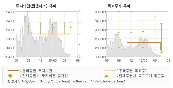 오늘 흥국증권에서 발표된 'HOLD(유지)'의견 및 목표주가 220,000원은 전체의견을 소폭 하회하는 수준으로 약간이나마 보수적으로 표현된 것으로 풀이되며 목표가평균 대비 8.8%정도 미달하고 있는 것으로 집계되었다. 참고로 최근에 목표주가를 가장 공격적으로 제시한 LIG투자증권에서 투자의견 '매수(유지)'에 목표주가 330,000원을 제일 보수적인 의견을 제시한 메리츠종금증권에서 투자의견 'HOLD'에 목표주가 208,000원을 제시한 바 있다.