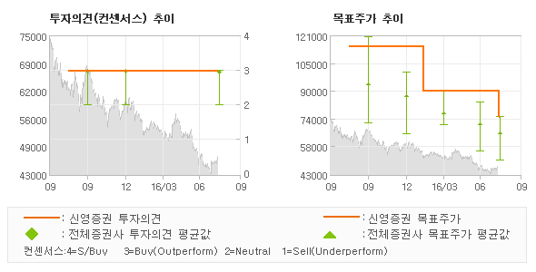 신영증권의 동종목에 대한 최근 1년동안의 투자의견은 전체적으로 큰 변화없이 유지되고 있다. 목표주가는 2015년8월 115,000원까지 높아졌다가 2016년2월 90,000원을 최저점으로 목표가가 제시된 이후 최근에 75,000원으로 새롭게 조정되고 있다.