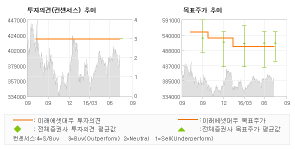 오늘 미래에셋대우에서 발표된 '매수(유지)'의견 및 목표주가 500,000원은 전체 컨센서스 대비해서 대체적으로 평균치에 해당하는 수준으로, 이번 의견은 동종목에 대한 전체적인 흐름에서 크게 벗어나지 않은 것으로 파악되며 목표가평균과 대비해서 미미한 차이가 나는 것으로 집계되었다. 참고로 최근에 목표주가를 가장 공격적으로 제시한 삼성증권에서 투자의견 '매수'에 목표주가 550,000원을 제일 보수적인 의견을 제시한 미래에셋증권에서 투자의견 '매수'에 목표주가 432,000원을 제시한 바 있다.