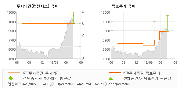KTB투자증권의 동종목에 대한 최근 1년동안의 투자의견은 전체적으로 큰 변화없이 유지되고 있다. 목표주가는 2015년8월 7,500원이 저점으로 제시된 이후에 최근에는 11,000원까지 상향조정되고 있다.
