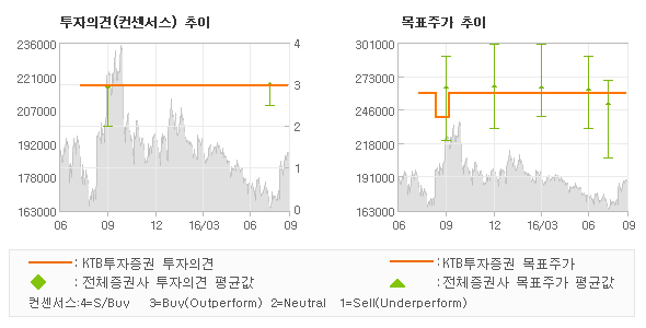 KTB투자증권의 동종목에 대한 최근 1년동안의 투자의견은 전체적으로 큰 변화없이 유지되고 있다. 목표주가는 한때 2015년9월 240,000원을 저점으로 기록된 이후 최근에 260,000원까지 다시 상향조정되고 있다.