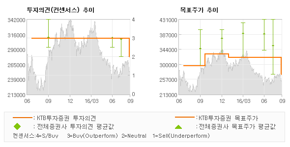 KTB투자증권의 동종목에 대한 최근 1년동안의 투자의견은 전체적으로 조금 하향조정되고 있다. 목표주가는 2015년10월 330,000원까지 높아졌다가 2016년1월 320,000원을 최저점으로 목표가가 제시된 이후 최근에 270,000원으로 새롭게 조정되고 있다.