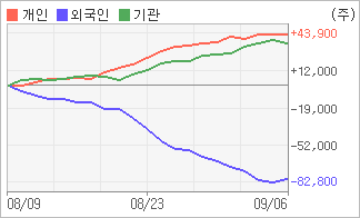 | 기관/개인 순매수, 외국인은 순매도(한달누적) 전일 외국인이 3,308주를 사들인 반면 기관은 2,768주를 팔았다. 4주간을 기준으로 보면 기관이 방향성있는 매매를 하면서 36,089주를 순매수했고, 개인들도 순매수량을 늘리며 43,327주를 순매수했다. 반면 그 동안 외국인은 매도 우위를 지속하면서 79,416주를 순매도했다. |