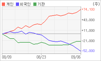 | 외국인과 기관은 순매도, 개인은 순매수(한달누적) 8월31일부터 전일까지 외국인이 5거래일 연속 동종목을 내다 팔았다. 4주간을 기준으로 보면 외국인이 매도 우위를 지속하면서 51,962주를 순매도했고, 기관도 매도 우위를 보이면서 22,068주를 순매도했지만, 개인은 오히려 순매수량을 늘리며 74,030주를 순매수했다. |
