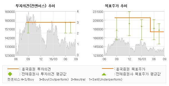 오늘 흥국증권에서 발표된 '매수(유지)'의견 및 목표주가 180,000원은 전체의견에 수렴하면서 시장의 평균적인 기대감이 비교적 객관적으로 표현된 것으로 풀이되며 목표가평균과 대비해서 미미한 차이가 나는 것으로 집계되었다. 참고로 최근에 목표주가를 가장 공격적으로 제시한 유진투자증권에서 투자의견 '매수(유지)'에 목표주가 200,000원을 제일 보수적인 의견을 제시한 한화투자증권에서 투자의견 'HOLD(유지)'에 목표주가 150,000원을 제시한 바 있다.