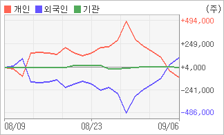 | 외국인/기관 순매수, 개인은 순매도(한달누적) 8월30일부터 전일까지 외국인이 6거래일 연속 동종목을 사들였다. 4주간을 기준으로 보면 외국인이 매매관점을 매도에서 매수로 전환하면서 99,545주를 순매수했고, 기관도 초반에 동종목을 순매수한 이후에 최근에는 순매수량이 줄어들고 있음에도 불구하고 3,366주를 순매수했다. 반면 개인들은 매도 우위로 반전되면서 102,911주를 순매도한 것으로 나타났다. |